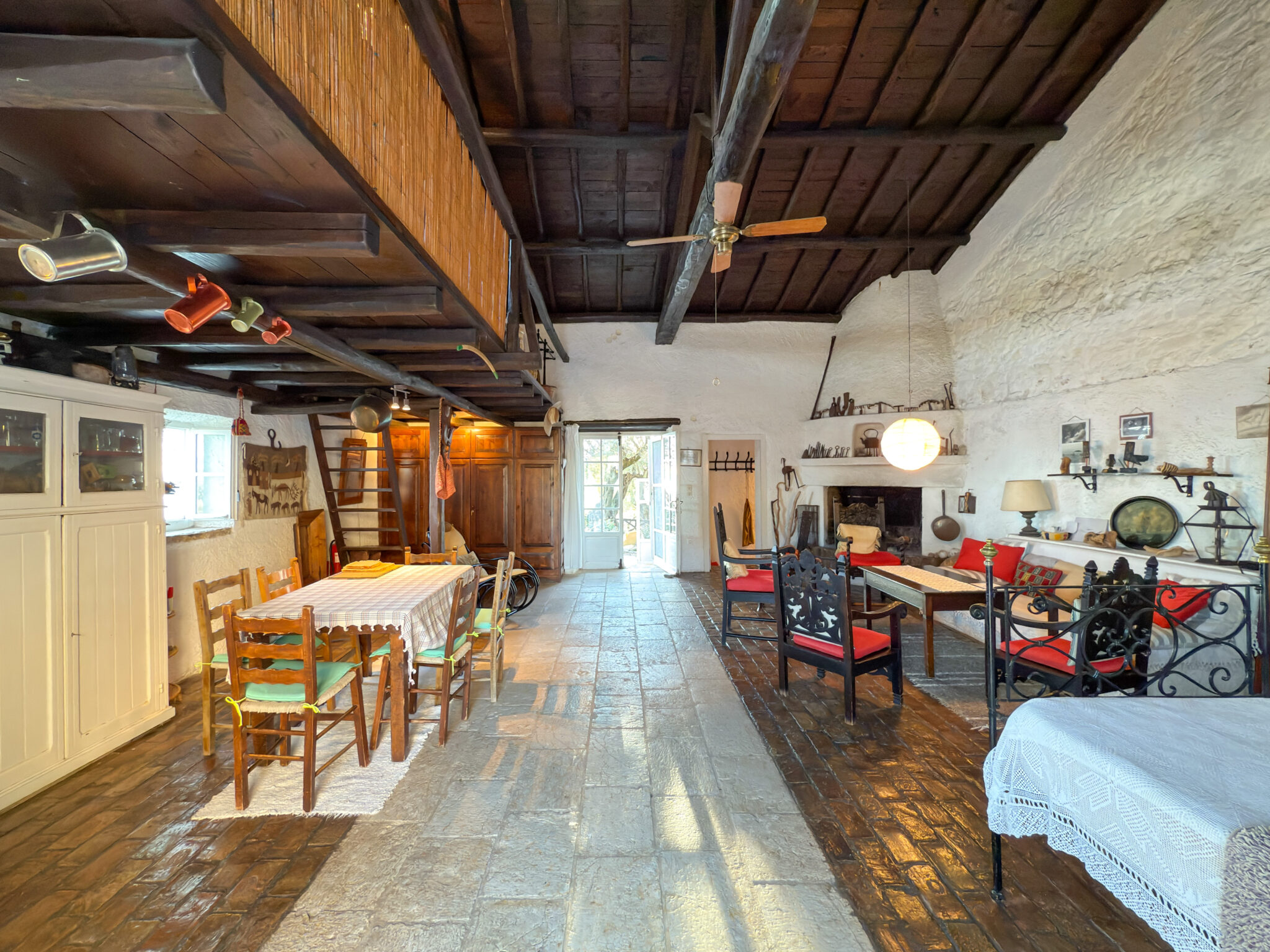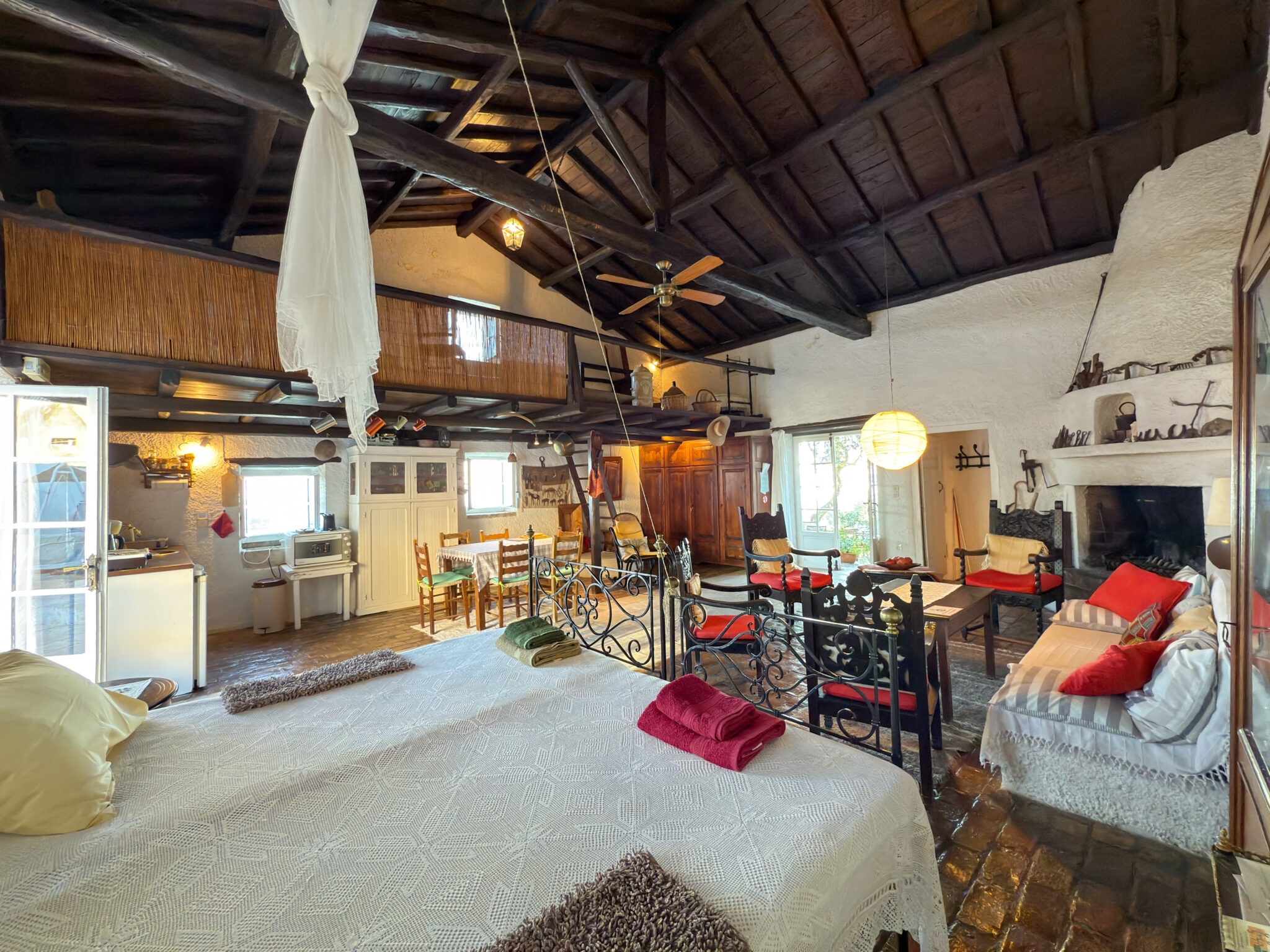 The main house includes a kitchen, bathroom, an open bedroom with two single beds, a traditional fireplace, and a wooden mezzanine with two additional beds.