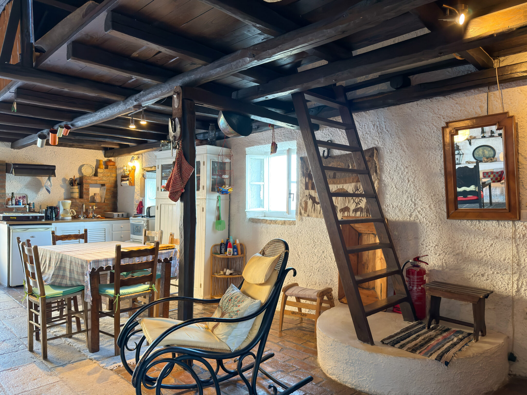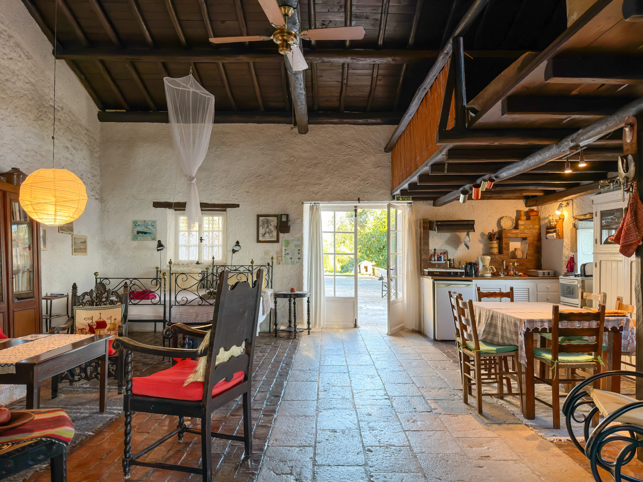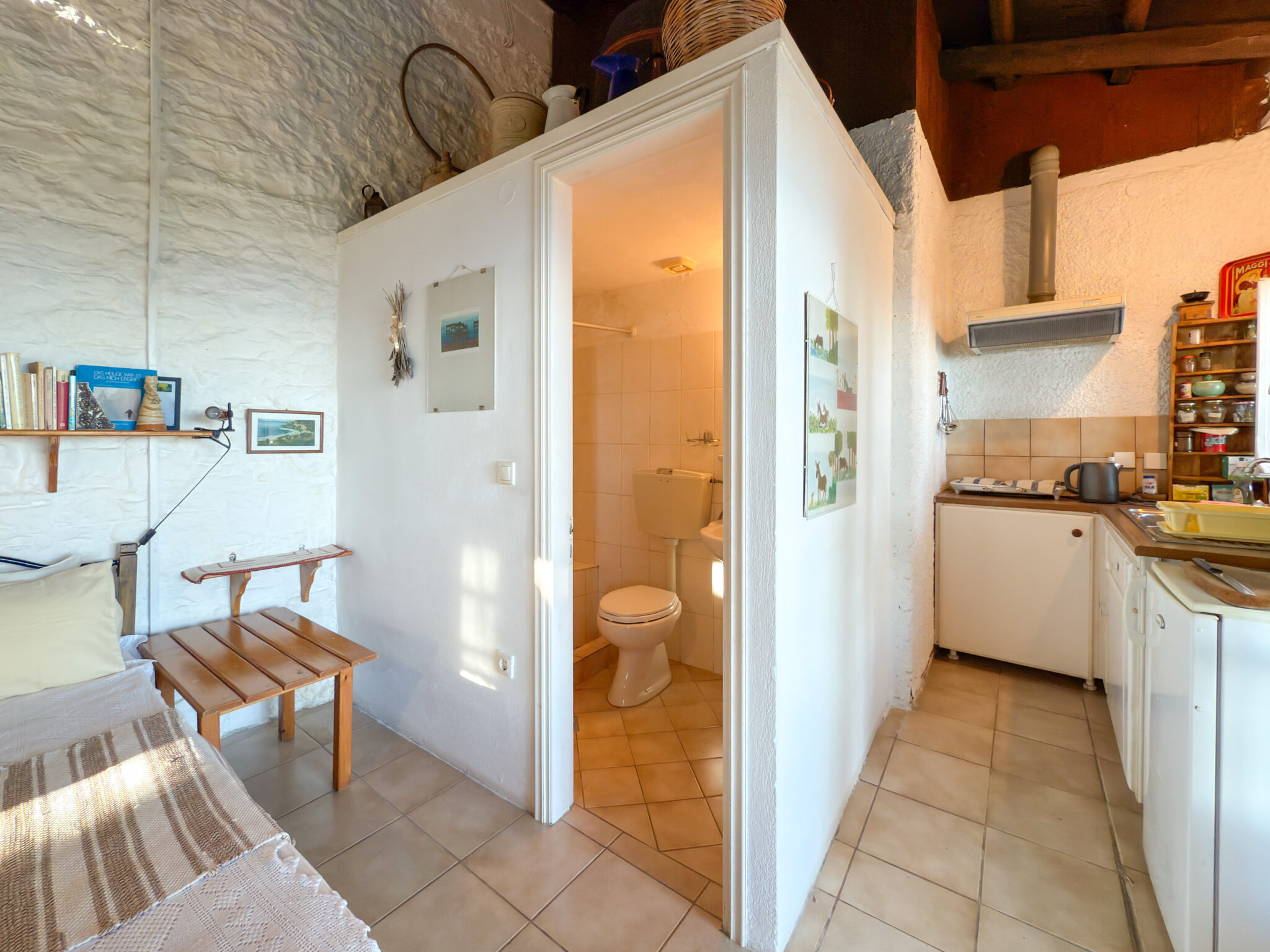 The adjacent stone guest house contains a twin bedroom, a small kitchenette and a second bathroom. Together they comfortably host up to six guests, with each building maintaining its own character while remaining close enough for shared living.
