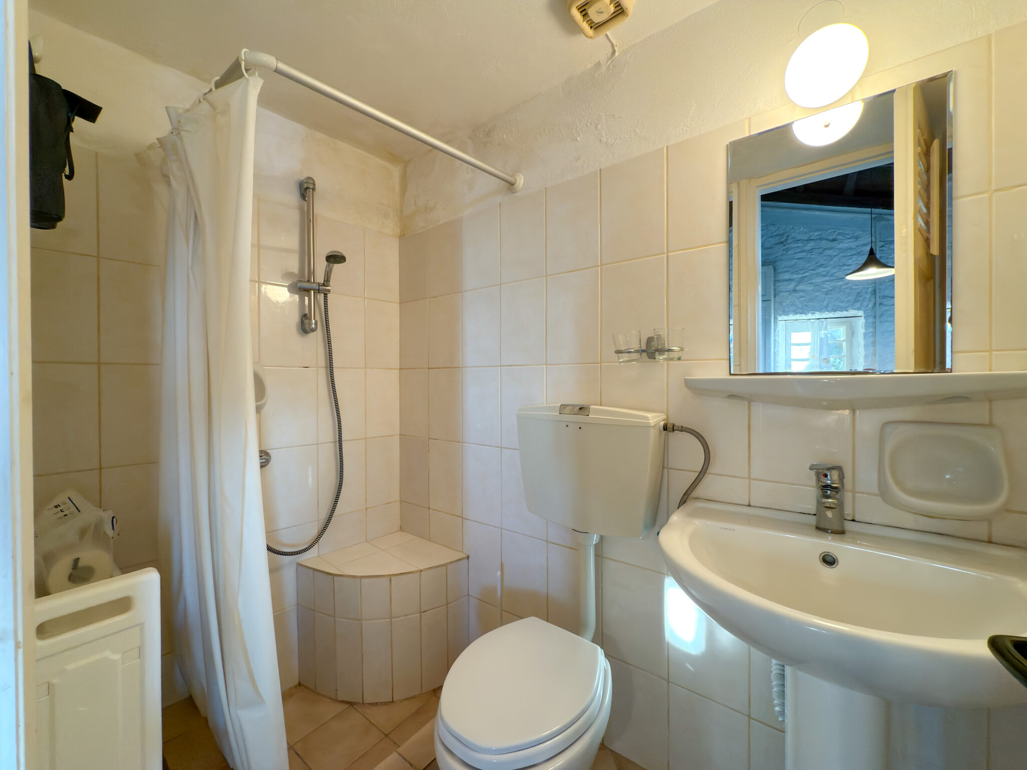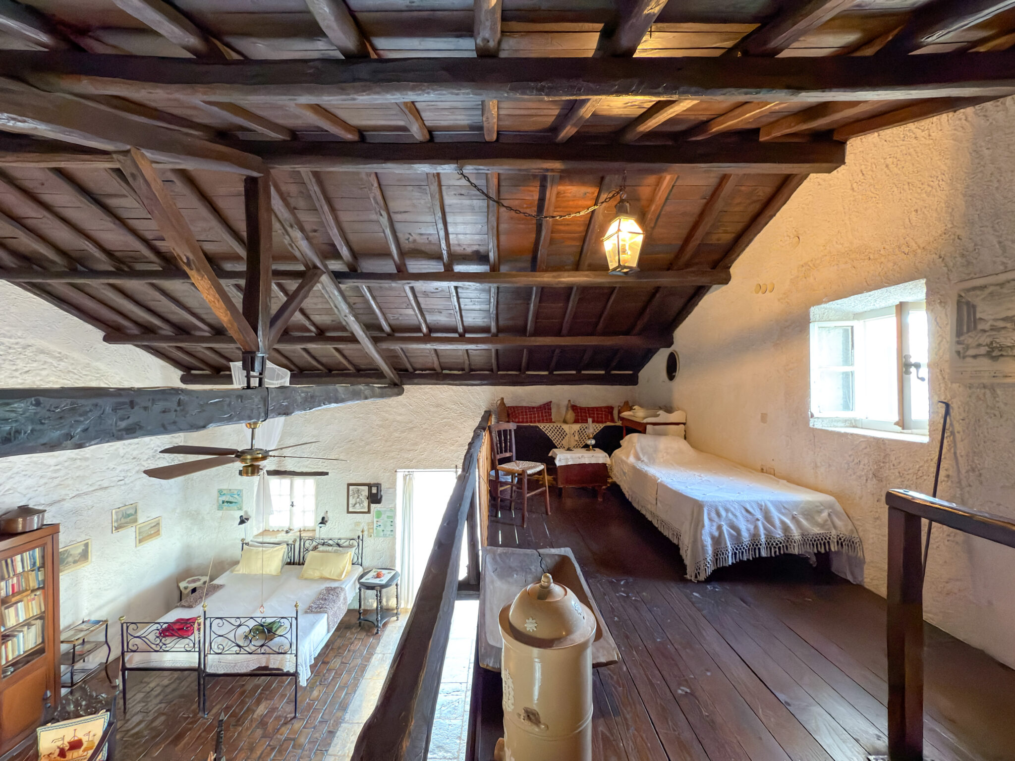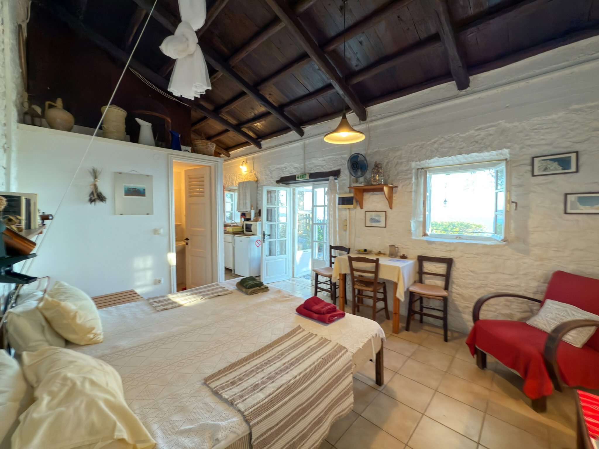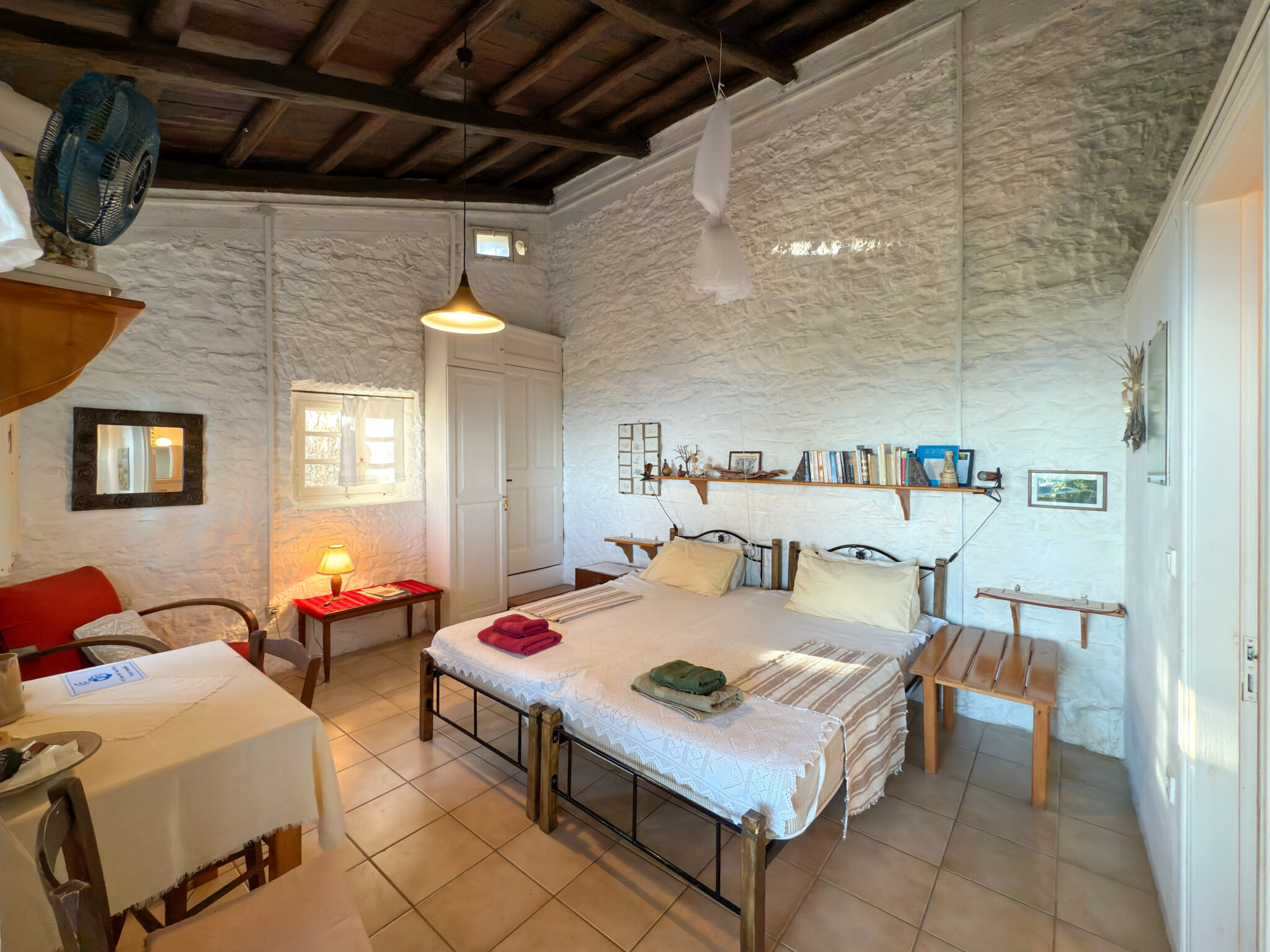 The adjacent stone guest house contains a twin bedroom, a small kitchenette and a second bathroom. Together they comfortably host up to six guests, with each building maintaining its own character while remaining close enough for shared living.