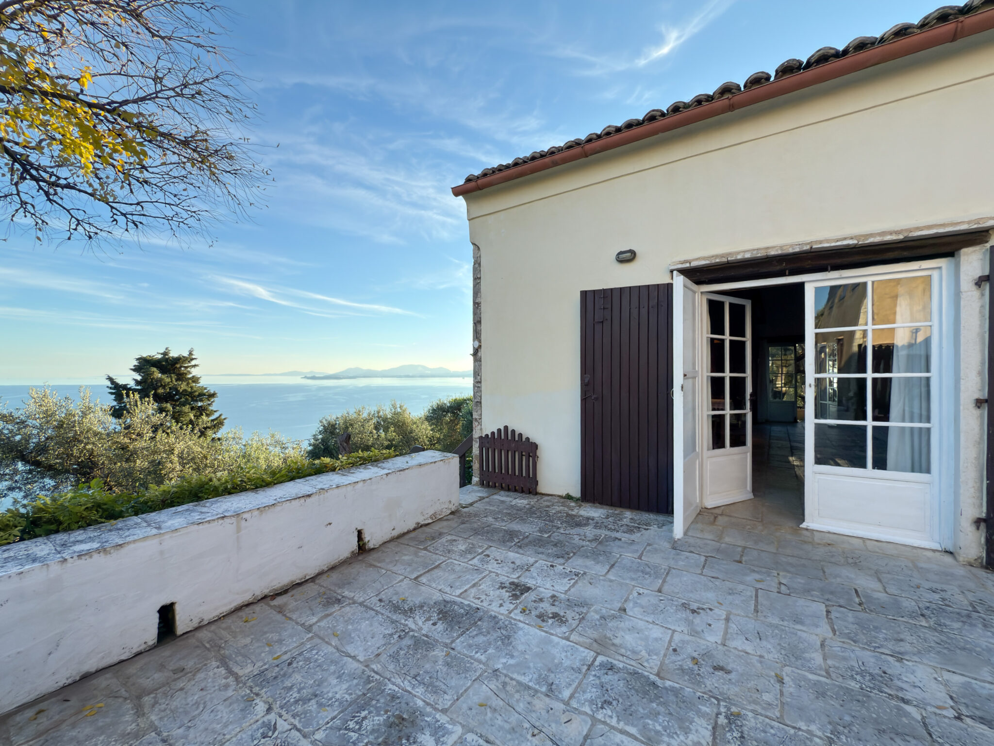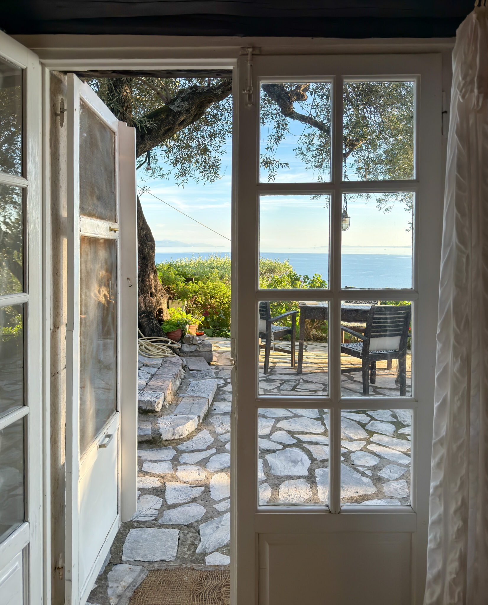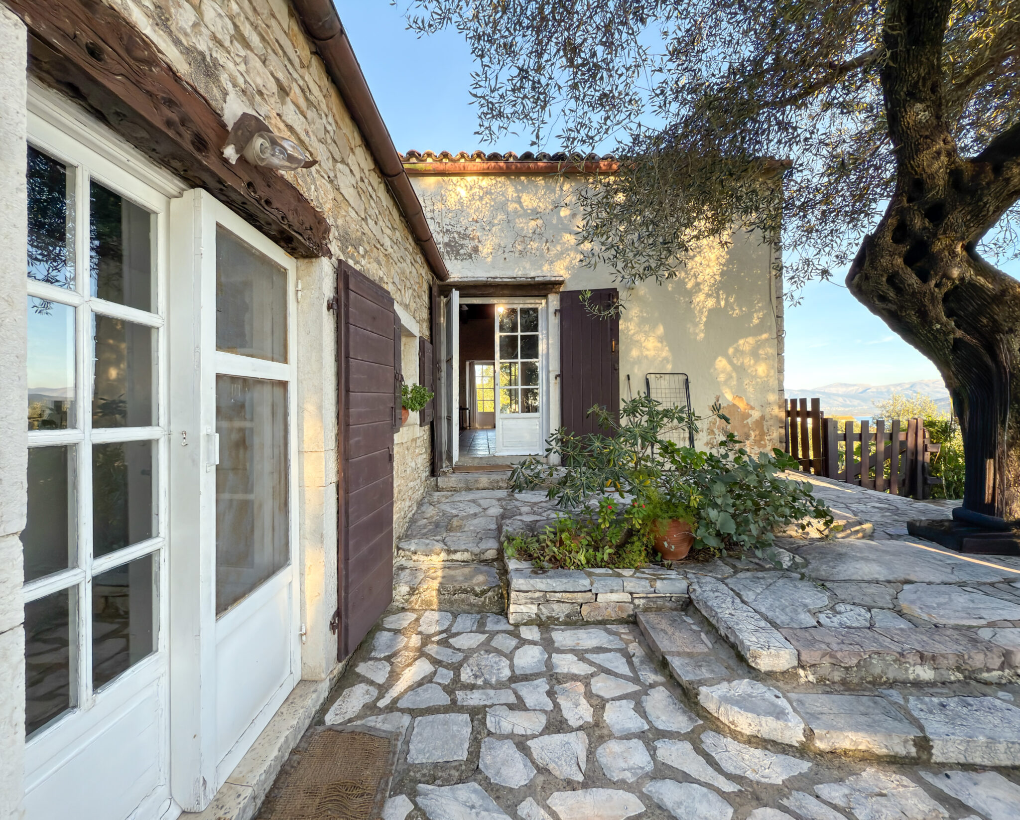 The farmhouse stands on the lower slopes of Mount Pantokrator, overlooking the Ionian Sea. Its position inside a private grove creates a secluded, peaceful environment while remaining only a short drive from the beaches and coves of Agni, Krouzeri, Kalami, Nissaki and Barbati. Guests wake to sunrise over the water, spend their days between the grove and the coast, and return each evening to the soft shade of centuries-old olive trees. It is a retreat meant for travellers who value slow living, nature and simplicity.