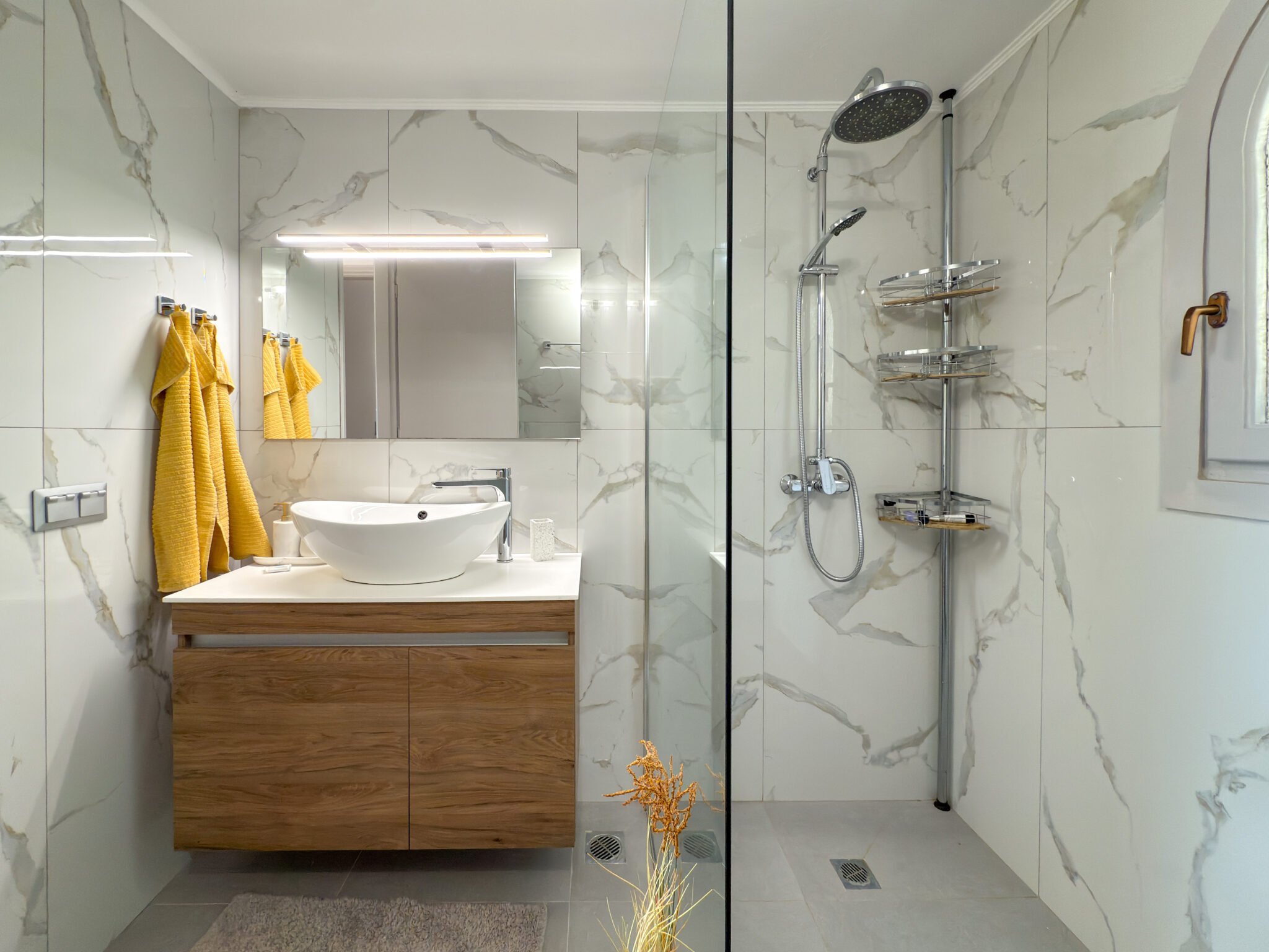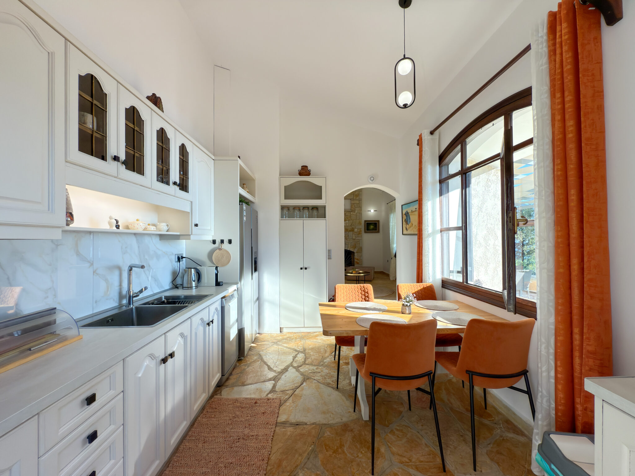 An open-plan living and dining area connects directly to a wide sea-view terrace, which becomes the heart of the house throughout the day. From early morning light to late evening sunsets, the terrace serves as the main living space — ideal for outdoor dining, reading, and watching the changing colours of the sea below.