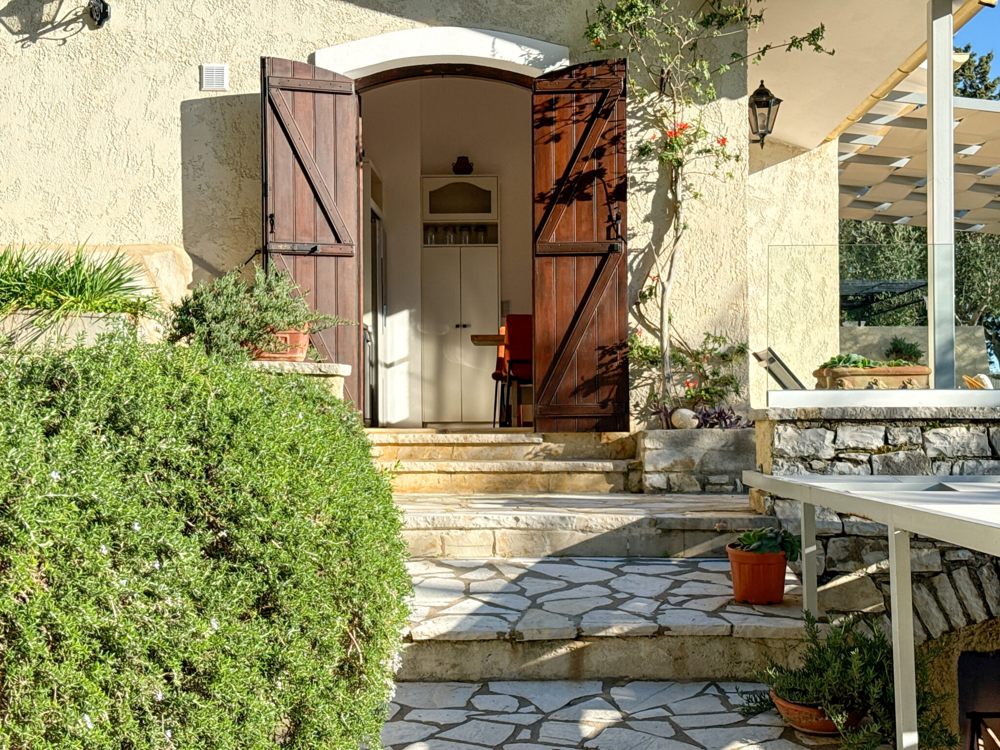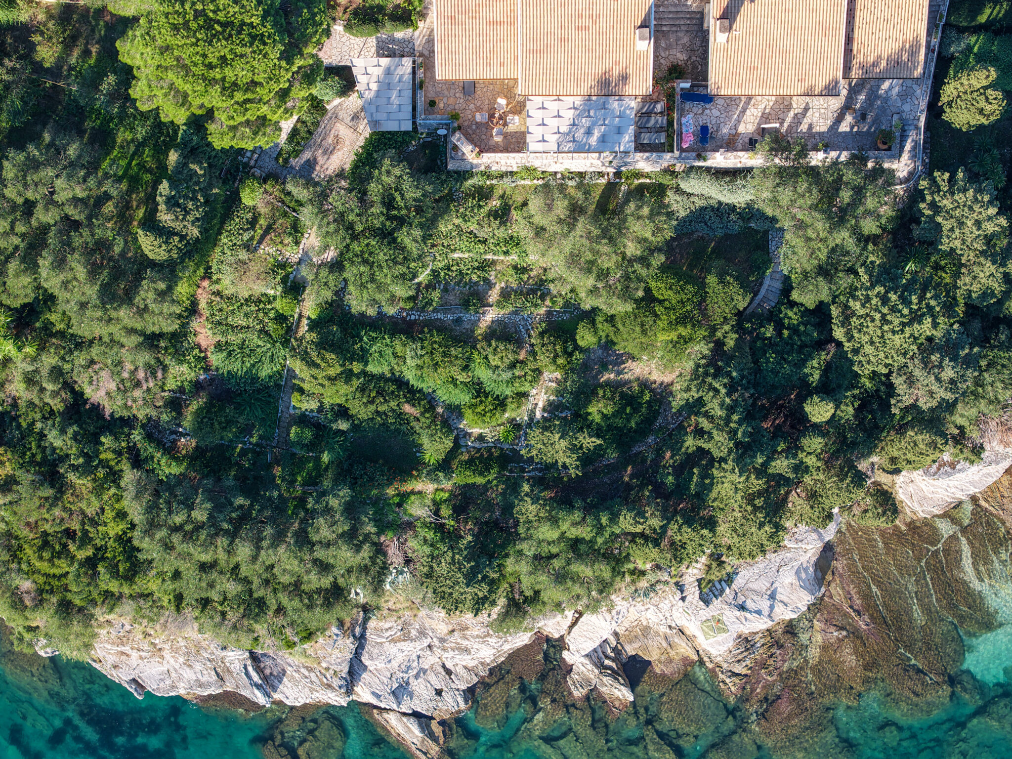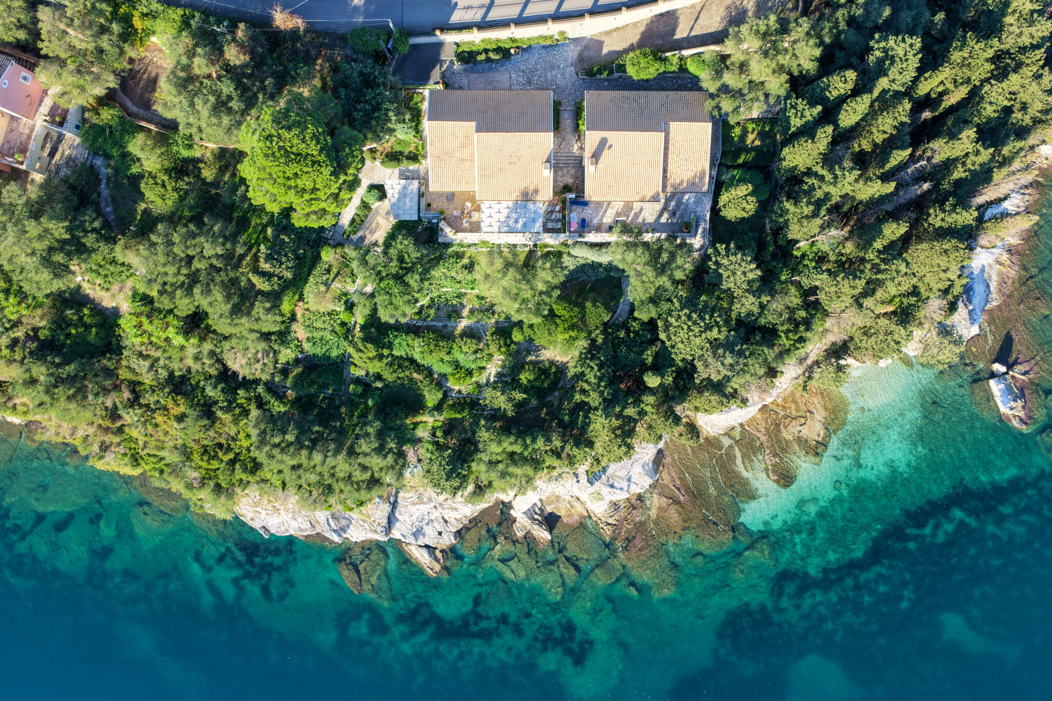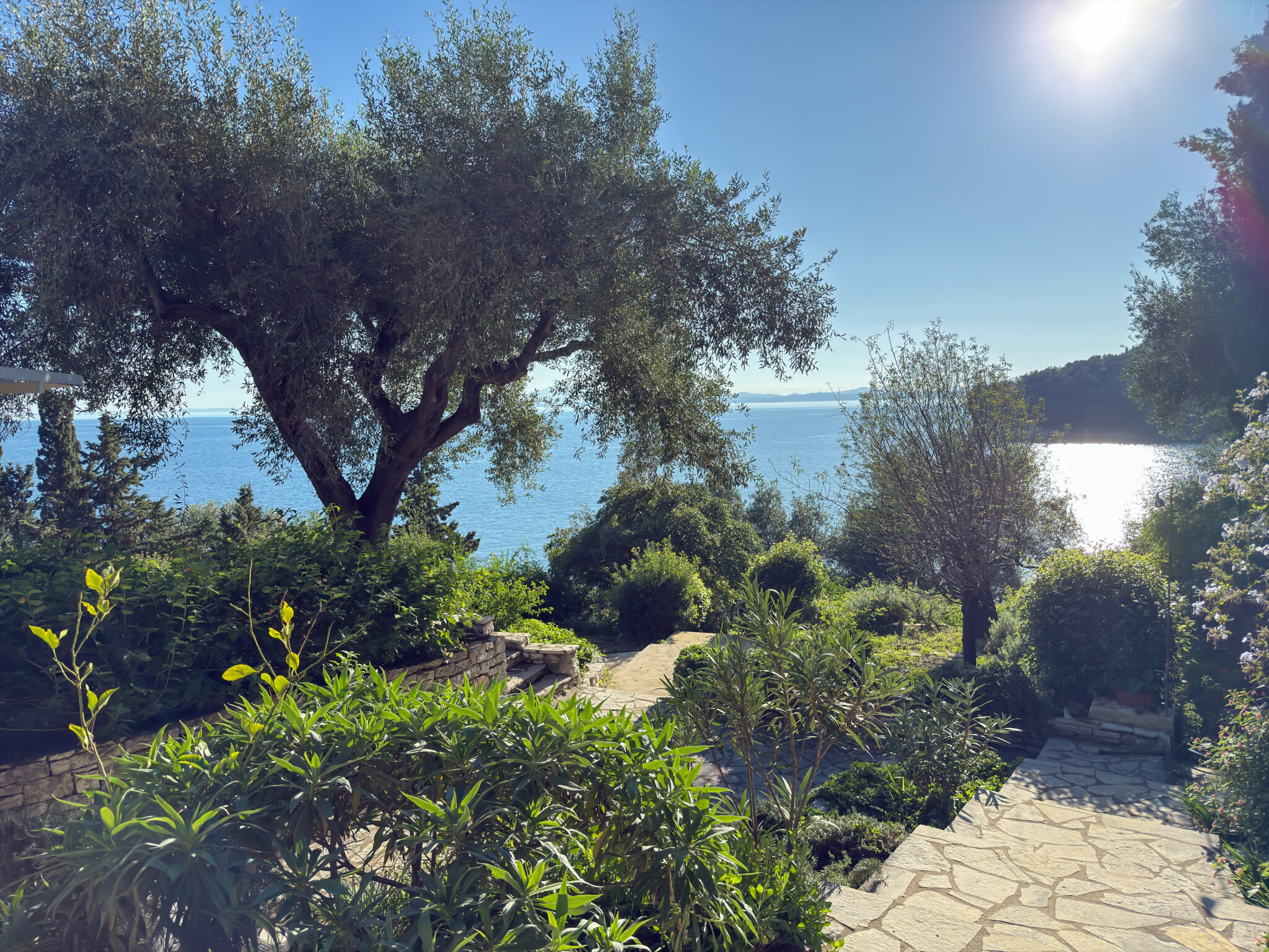 The villa sits above the shoreline, surrounded by olive trees and Mediterranean vegetation, with open views stretching across the Ionian. Its elevated position ensures silence and privacy, while a discreet stone pathway leads down through the gardens to a private rock platform at sea level.