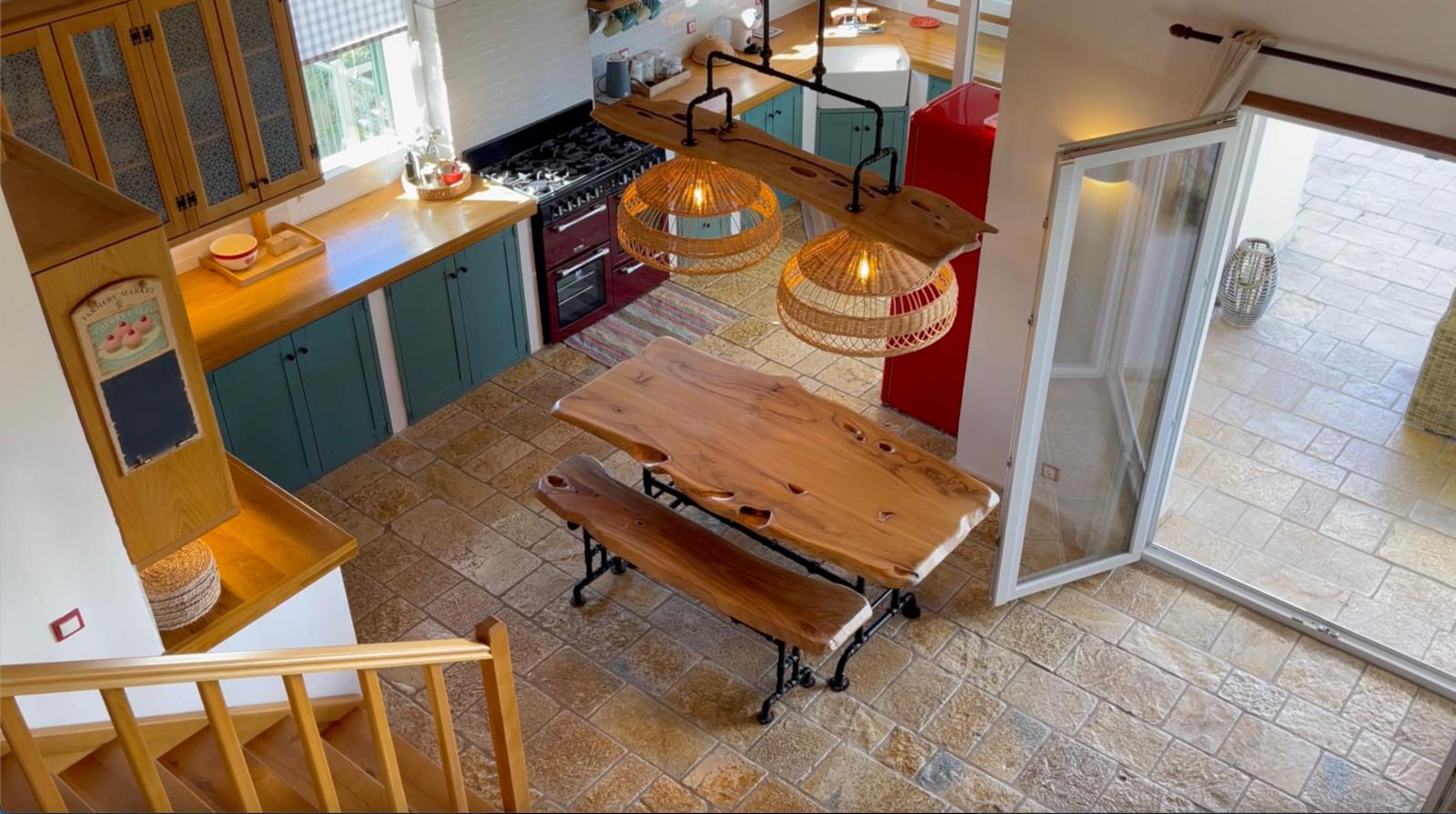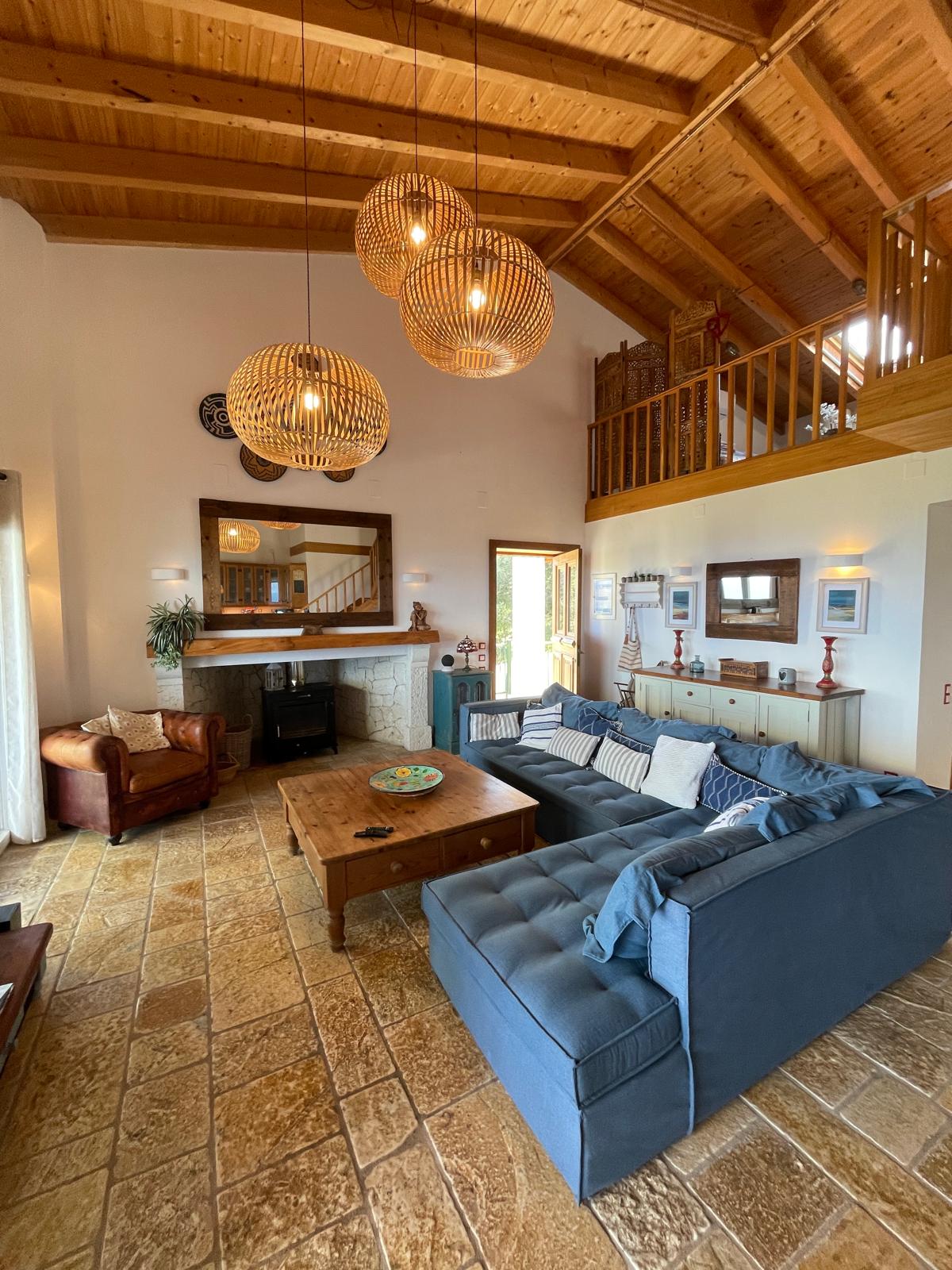 The heart of the villa is the bright open-plan living and dining area with high beamed ceilings and wide picture windows that frame the sea view. A solid stone inglenook-style fireplace with wood-burning stove creates a warm focal point for cooler evenings, complemented by the underfloor heating. The adjacent kitchen features solid wood cabinetry with a contemporary-traditional finish and opens directly onto a covered terrace with an outdoor kitchen, barbecue, fridge and sink — perfect for effortless indoor-outdoor living.