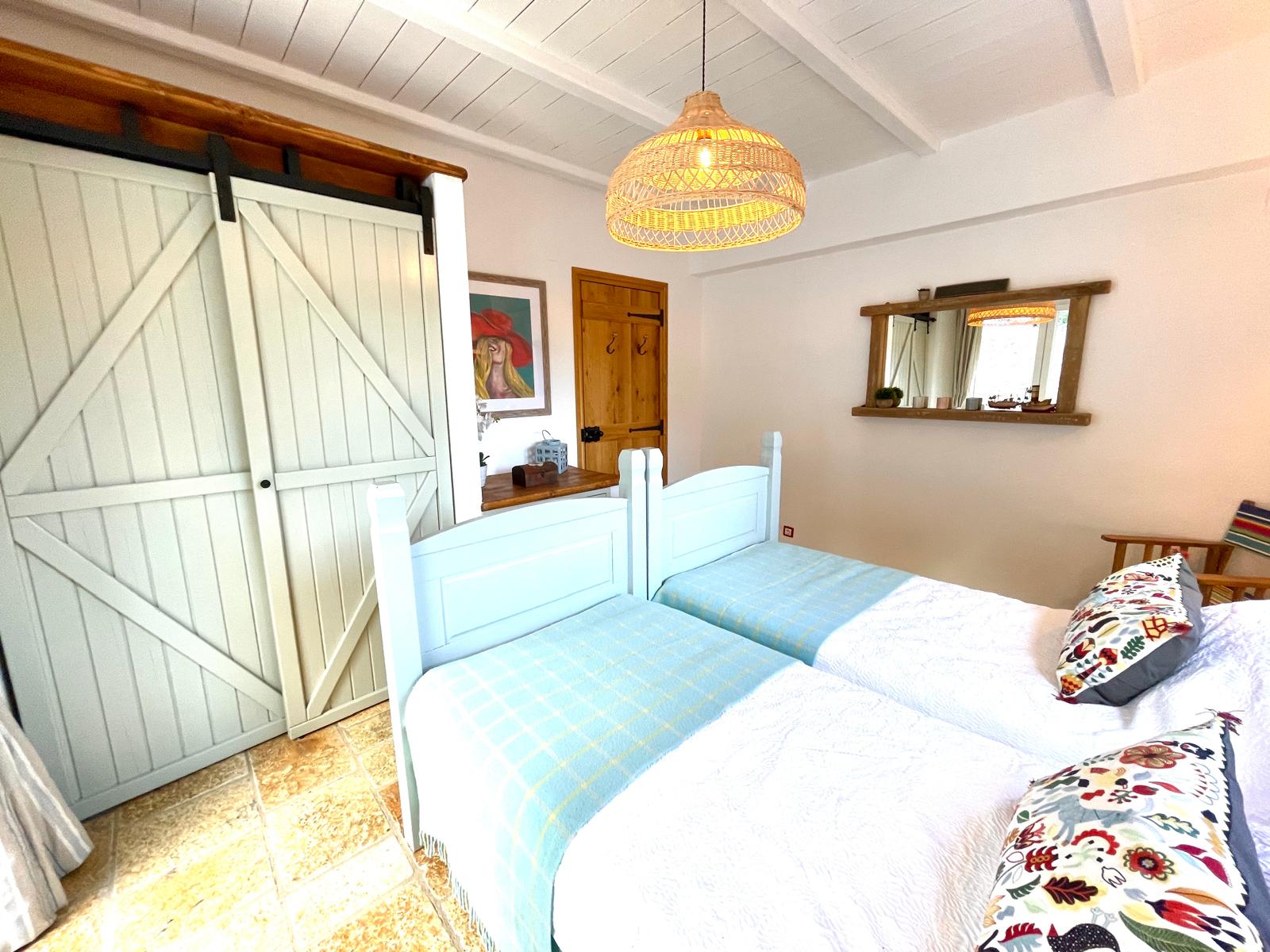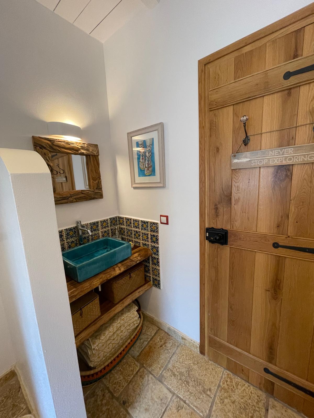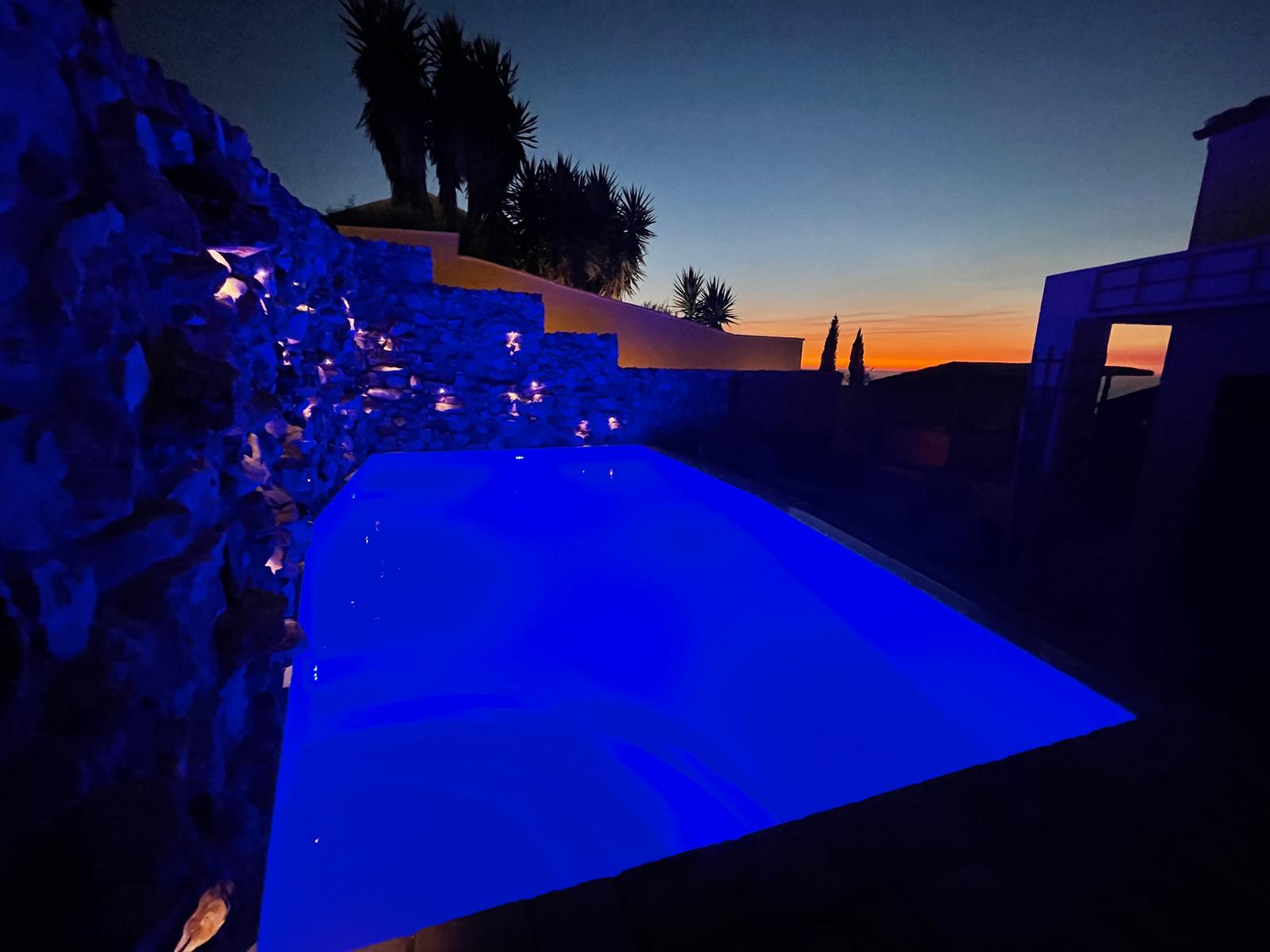 A striking wooden staircase leads to the mezzanine main bedroom, which enjoys dramatic sea views and its own half-open bathroom with skylights. The two additional bedrooms are located at the rear, both facing the pool; one has an en-suite shower room and both benefit from fitted wardrobes. A further shower room serves the third bedroom and guests.