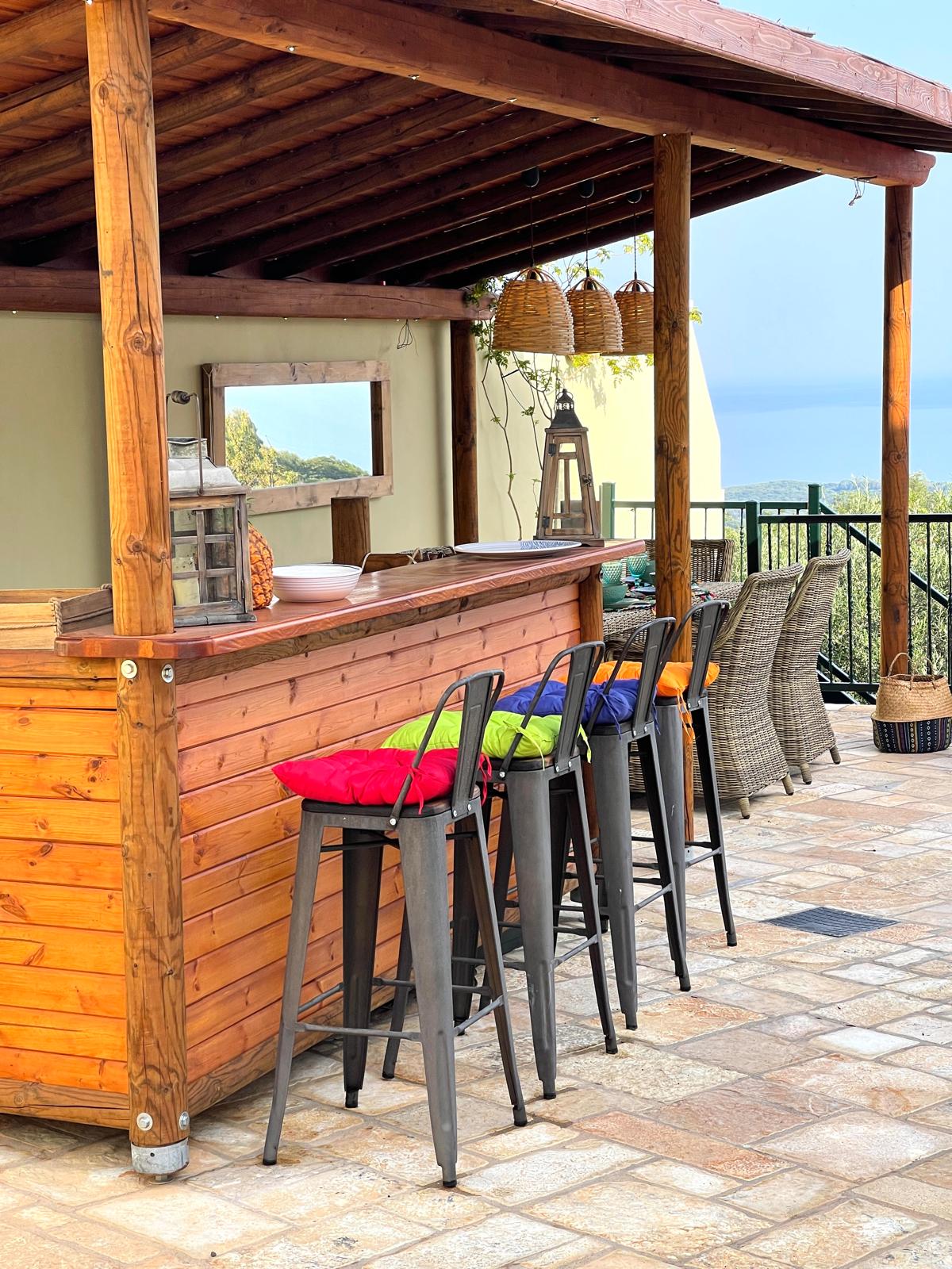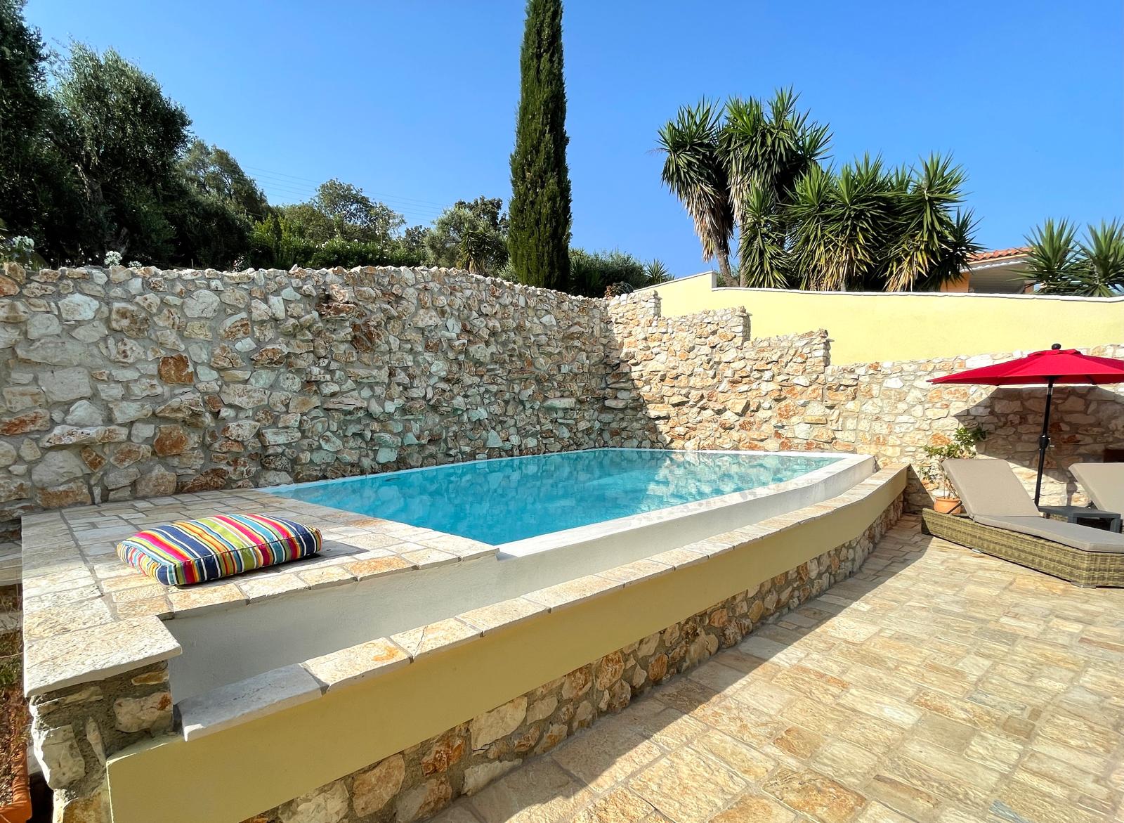 The outdoor areas are where Villa Kefi truly shines. A beautiful swimming pool with sea views sits to the rear of the villa, beautifully secluded by high natural stone walls. Broad stone terraces surround the pool, offering plenty of space for sunbathing and relaxed entertaining. A covered terrace off the kitchen provides shaded outdoor dining, while the sweeping driveway and mature Mediterranean planting give the property a settled, established feel.